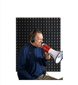 Several images were combined, retouched and color-adjusted to create this image of radio host Dan Dakich in a sound-proof booth. Shown above is an automated slideshow case study of this photo composition from start to finish.