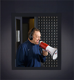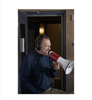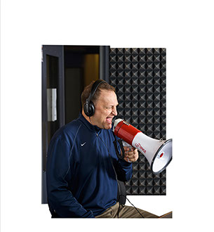 Several images were combined, retouched and color-adjusted to create this image of radio host Dan Dakich in a sound-proof booth. Shown above is an automated slideshow case study of this photo composition from start to finish.